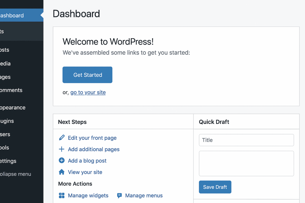 You can install WordPress on your web hosting in just a few clicks. Once it’s set up, you’ll access your WordPress Dashboard, where you can manage your site — create new posts, edit pages, upload images, and customize your theme.